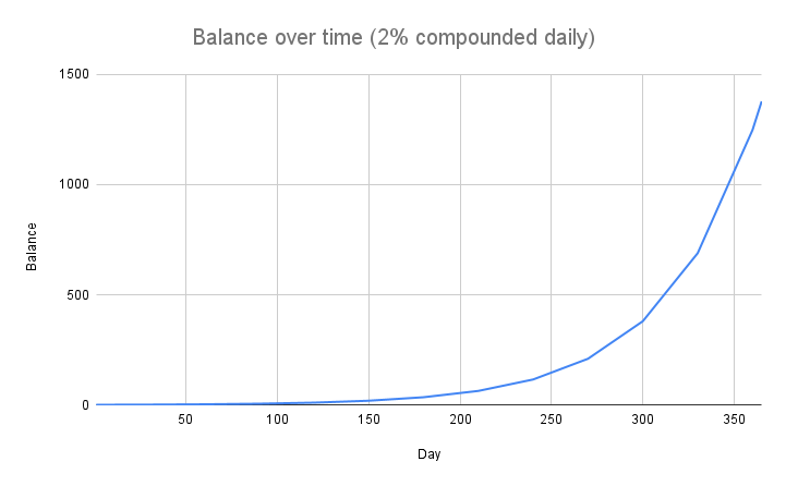 One interesting fact about APY is that your balance will grow not linearly but exponentially over time! Assuming a daily compound interest of 2%, if you start with a balance of 1 CLAM on day 1, after a year, your balance will grow to about 1377. That is a lot!