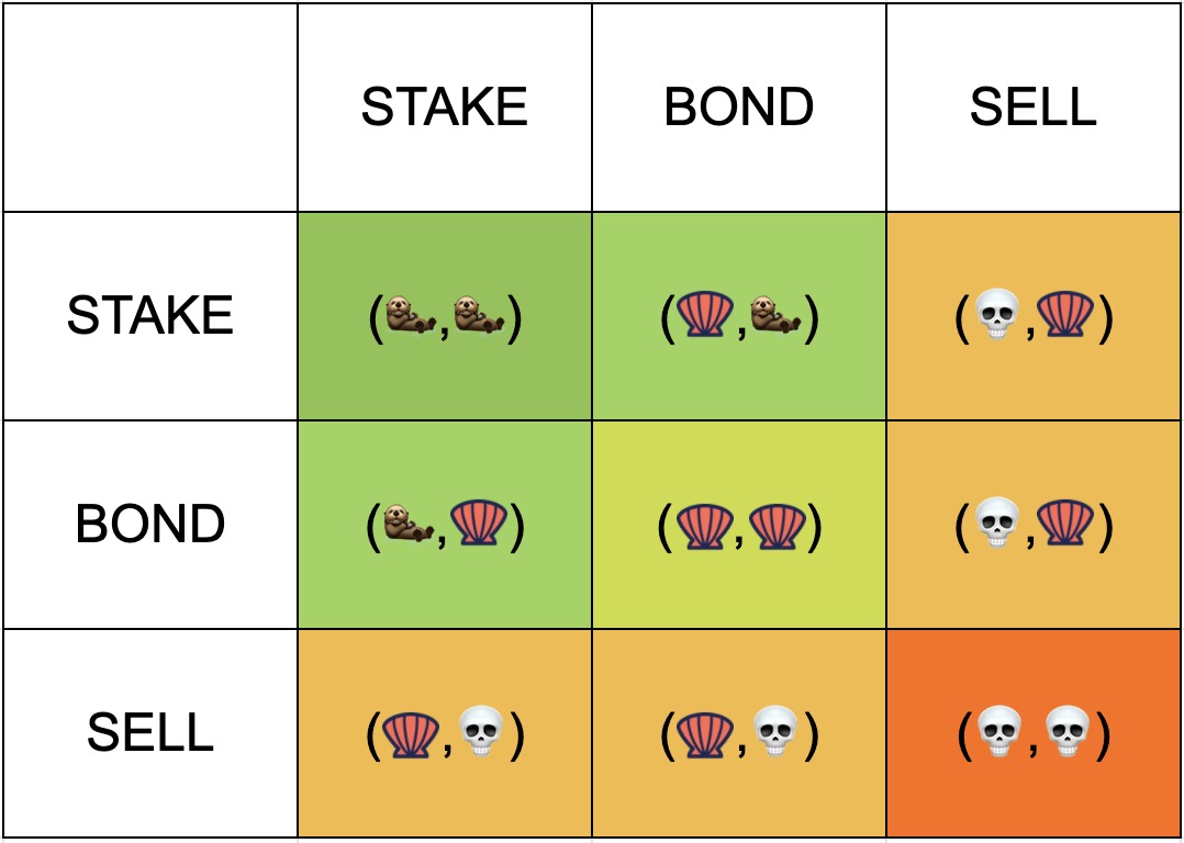 When we both sell, it creates the worst outcome for both of us and the protocol (💀,💀).